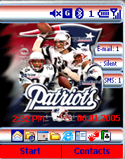Guest Dale1313 Posted January 6, 2005 Report Posted January 6, 2005 File Name :: Patriots Author :: Dale1313 Category :: Sport Description :: Plugins: Date, Time, MRU,Profile,email,sms, Missed calls Extra Screens: Menu, start up, log on, shut down, log off Program:Homescreen designer Software: Adobe cs Here is another installment for the NFL..per request I have 3 different home screens available with slightly different coloring. Please report problems. Thank you Updated Mon, Jan 10 2005 9:24 pm View Filepatriots.cabpatriots2.cabpatriots3.cab