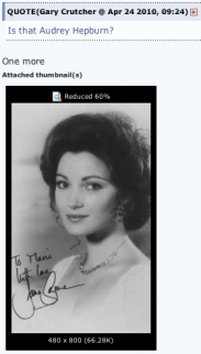 Guest Gary Crutcher Posted April 25, 2010 Report Posted April 25, 2010 :huh: Sorry, but she is not Audrey Hepburn... She is Jane Seymour (from "Somewhere in Time" with Christopher Reeve)... :P Uh...I was referring to Previa's previous pic.