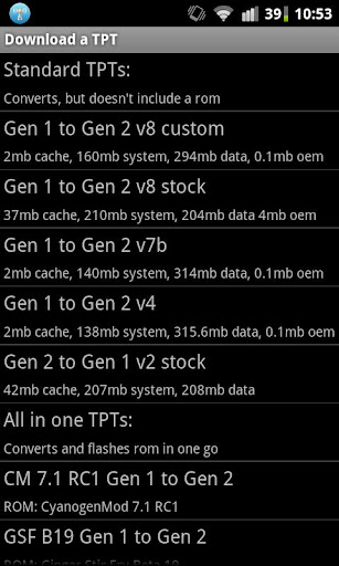 Guest Amphoras Posted March 10, 2012 Report Posted March 10, 2012 https://lh5.ggpht.co...dV7OZ89NpxuwMzA This is a picture from an older version. If you download the latest version from the market, then the first option will be "All In One". Click on that and you will get a list. Choose "Gen 1 to Gen 2 v10a". It will then start downloading the TPT, just wait and watch the screen. After the downloading bar gets to 100%, it will then show that its checking the md5sum of the file it downloaded. If that matches, it will then tell you that its unzipping it. Once it finishes unzipping, it will then check all the files inside the zip match the md5sums. Once it is finished, it will tell you "Number of matches: 17/17" if they all match. It it says any didn't match, or fails at an earlier stage, then you need to go back to the first screen and try again. If everything matched in the previous step, go back to the first screen. Make sure your battery is well charged. You should see an option called "Start TPT". Click on it, and it will ask if you have checked the image folder yet. If everything matched at the previous step, then click yes. Your phone should then reboot, and you should see the green text on the screen. Once it completes, your phone will reboot into clockwork recovery automatically. Once it gets here, flash the Swedish Snow zip you downloaded to your sdcard. Once you have flashed Swedish Snow, use TPT Helper, or any file manager to delete the image folder from your sdcard. This makes sure you don't start the TPT again by mistake.